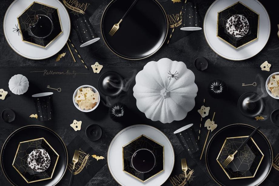Trick-or-treat bags, spooky packaging, Halloween cards, and themed party supplies in dark, atmospheric scenes. We had way too much fun styling these — carved pumpkins, candles, cobwebs, the whole setup.